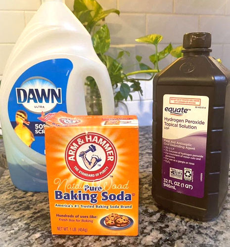 A couple of tablespoons of baking soda and three to four tablespoons of hydrogen peroxide.