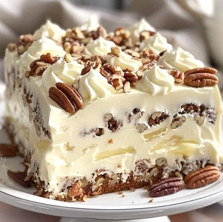 Cream Cheese Frosting: Beat the butter and softened cream cheese until creamy in a large bowl. Add the remaining vanilla essence, 2 cups of crushed pecans, and powdered sugar gradually, stirring until thoroughly combined.