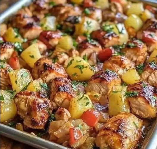 Put together: Arrange the rice, broccoli, red bell pepper, pineapple chunks, and marinated chicken on a large baking sheet.