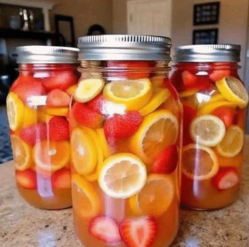Combine the sliced lemon, orange, and strawberries with the chilled tea in a big pitcher.